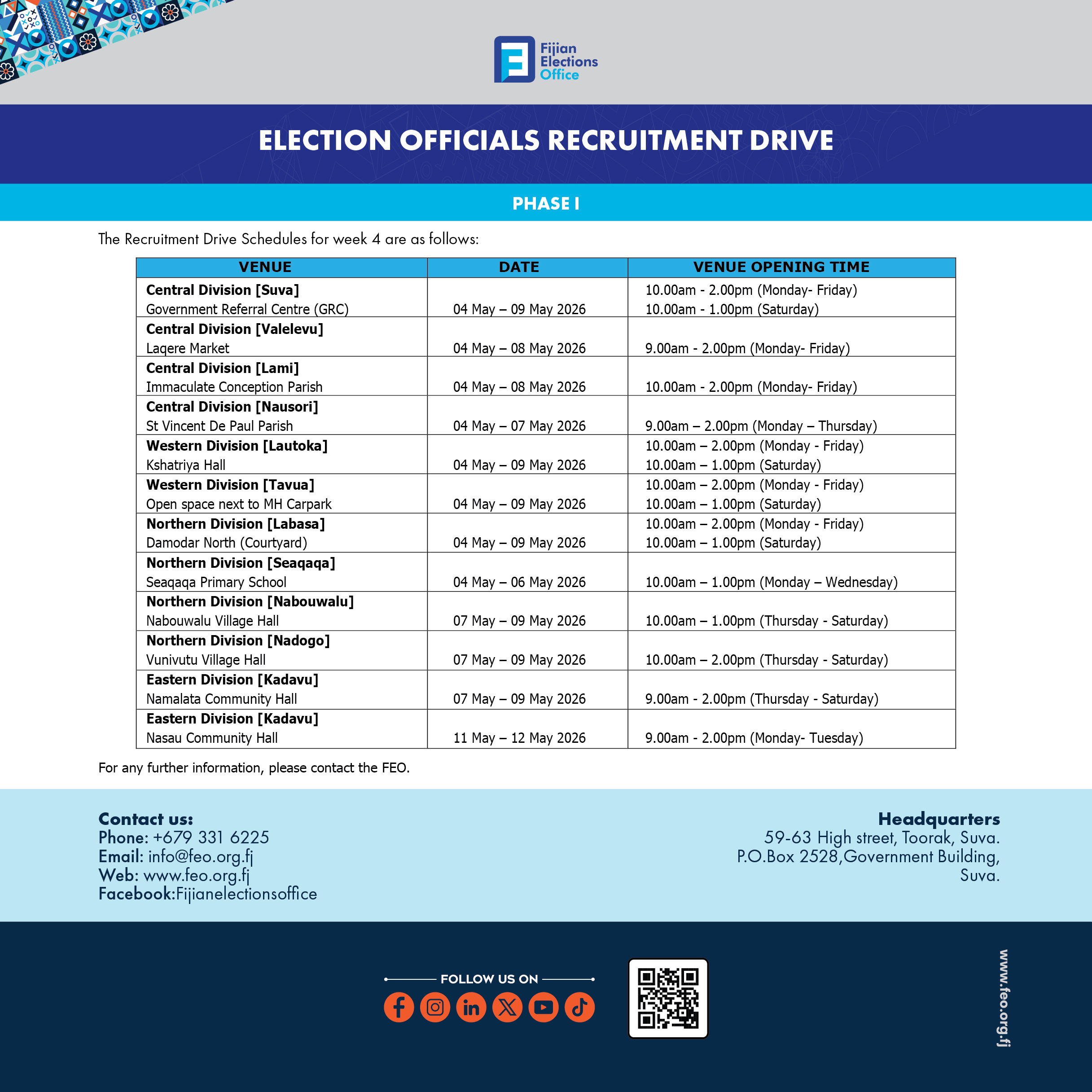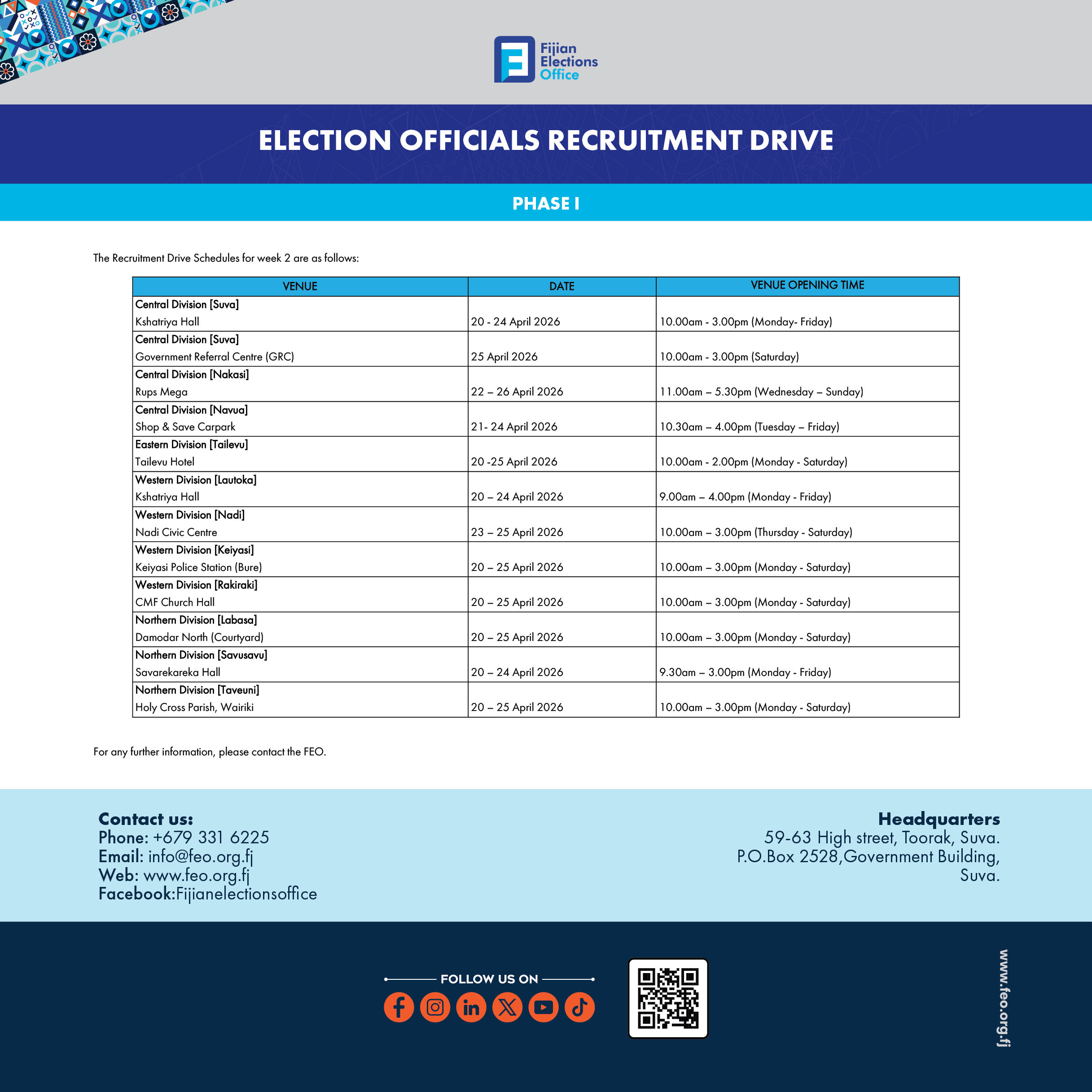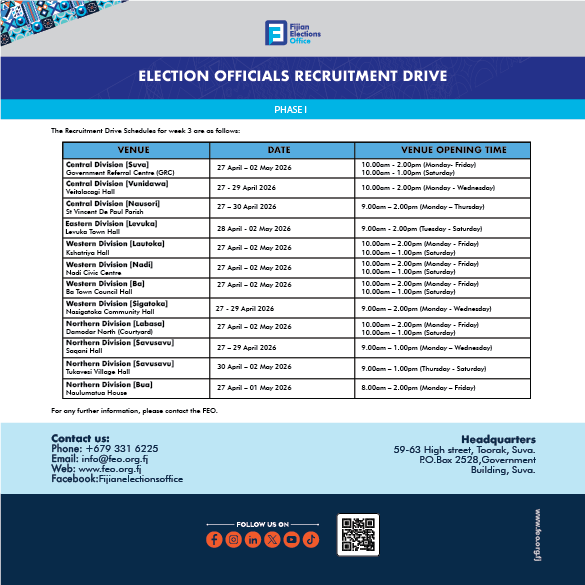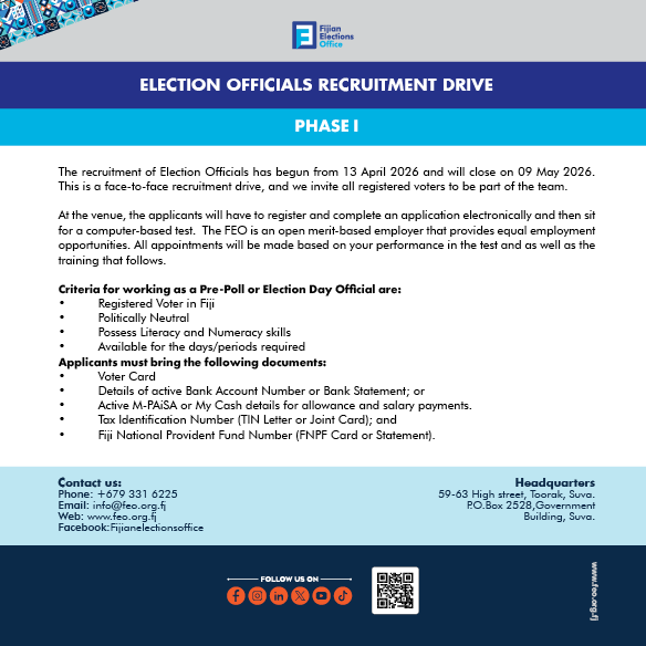 Bula Fiji! The Fijian Elections Office (FEO) invites every eligible Fijian to take the first step in shaping our nation’s future—register to vote. Whether you’re a first-time voter, living overseas, or simply need to update your details, now is the time to...